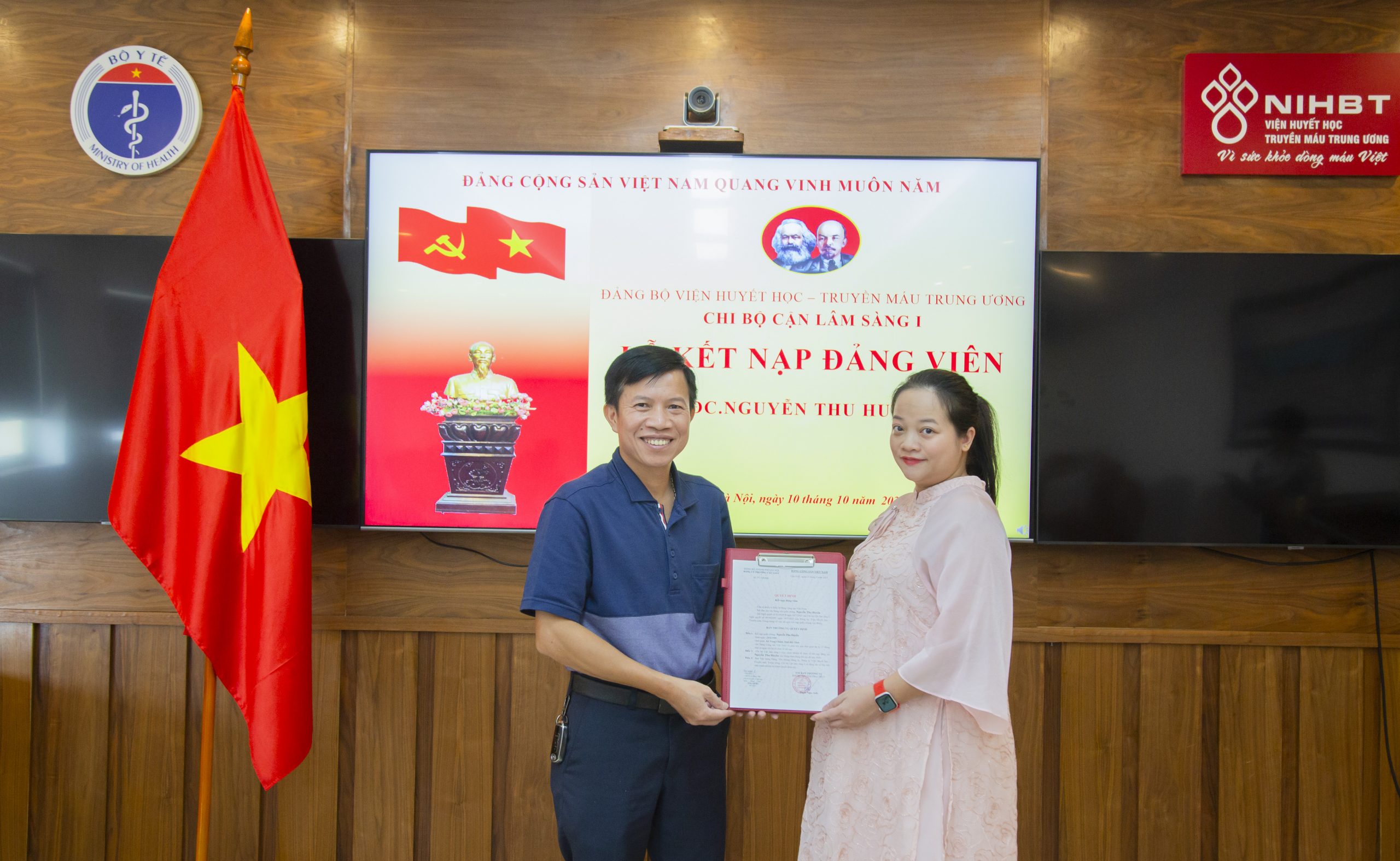 Các quần chúng ưu tú được kết nạp vào hàng ngũ của Đảng gồm: 1. Đ/c Đỗ Thị Thúy – Khoa Ghép tế bào gốc 2. Đ/c Phạm Thị Nghiệp – Khoa Điều trị hóa chất 3. Đ/c Bùi Kim Khánh – Khoa Tiếp nhận máu điểm lưu động 4. Đ/c Bùi Thúy Hường – Khoa Di truyền và sinh học phân tử 5. Đ/c Vũ Đức Quang – Khoa Đông máu 6. Đ/c Nguyễn Thu Huyền – Khoa Huyết thanh học nhóm máu |
