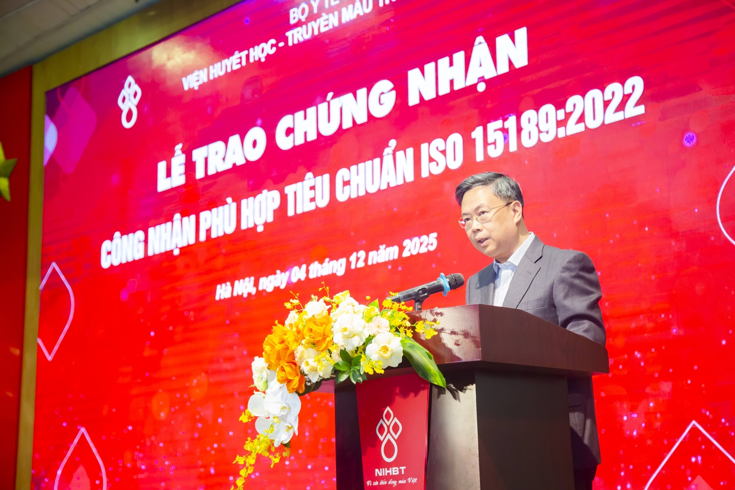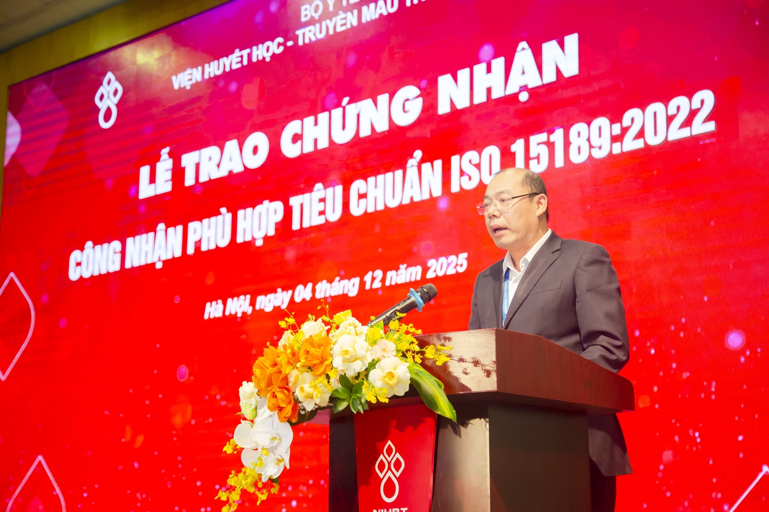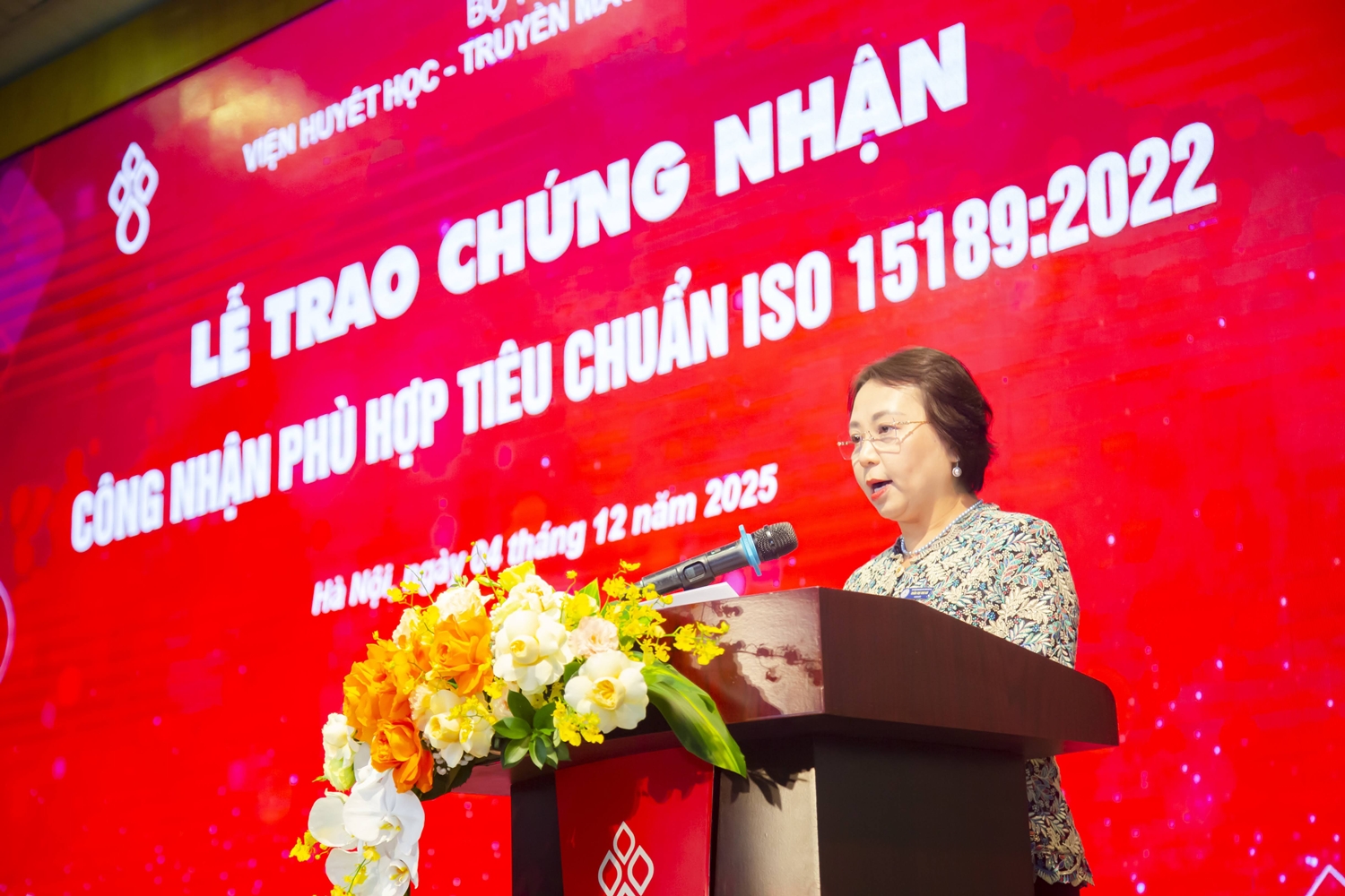 Phát biểu tại buổi lễ, PGS.TS. Nguyễn Hà Thanh, Viện trưởng Viện Huyết học – Truyền máu Trung ương cho biết chứng chỉ công nhận không chỉ là sự ghi nhận về chuyên môn, mà còn là minh chứng cho chất lượng và uy tín của Viện; khẳng định năng lực kỹ thuật và hệ thống quản lý xét nghiệm của Viện tiệm cận với trình độ quốc tế. Đây cũng là cơ sở để các kết quả xét nghiệm của Viện được liên thông, công nhận rộng rãi, giảm thiểu chi phí và thời gian cho người bệnh.
