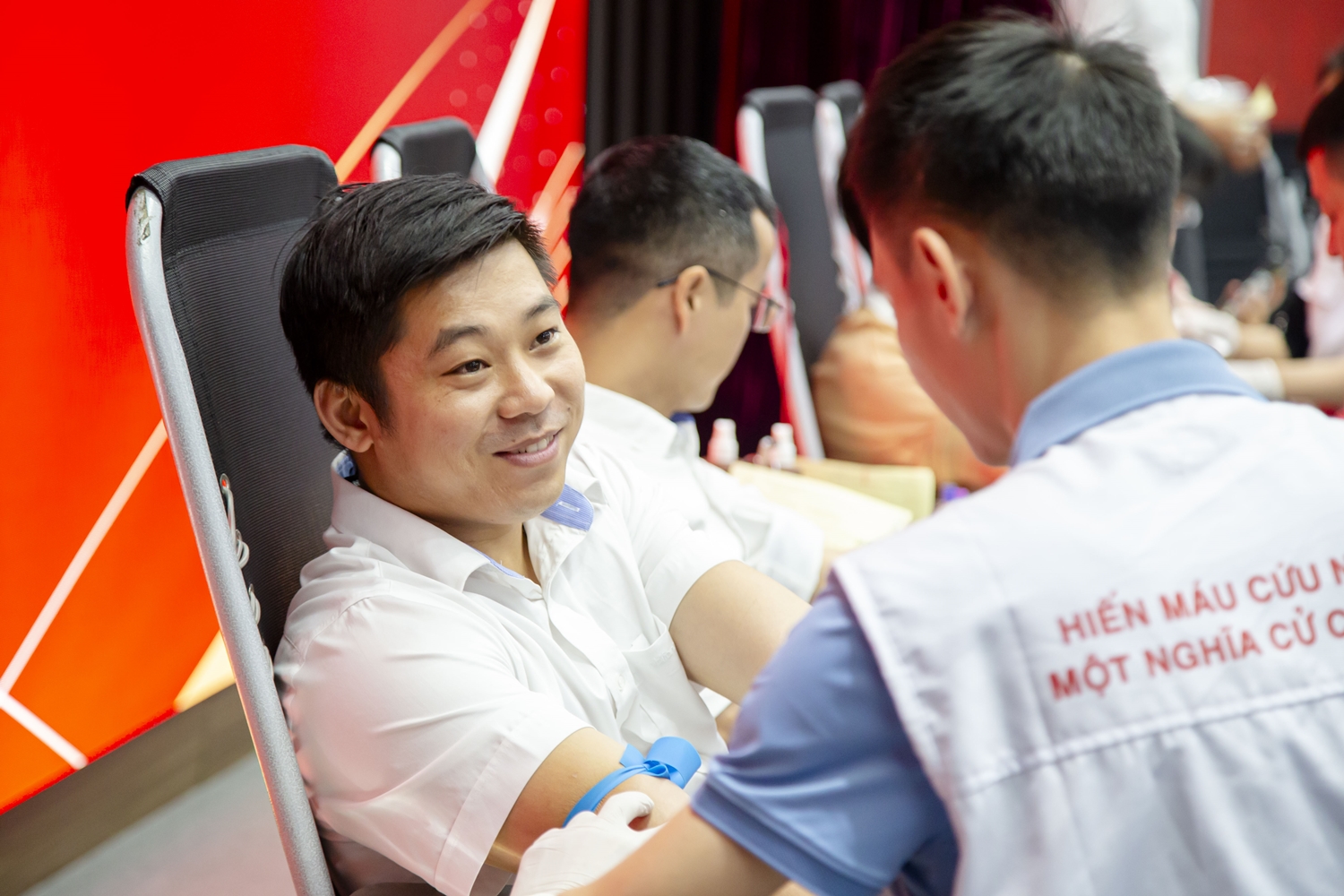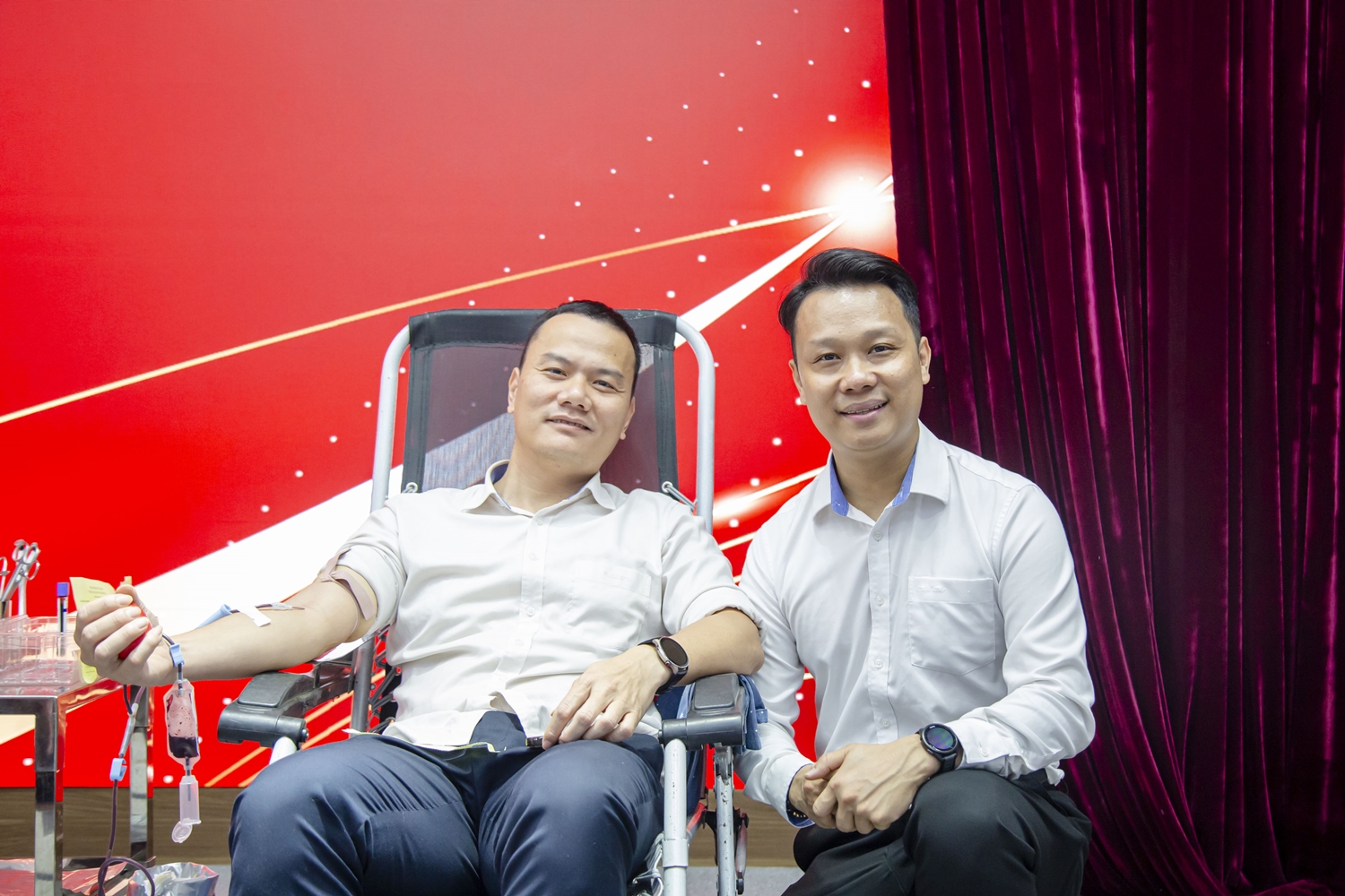 Anh Nguyễn Mạnh Hiếu (bên phải), Bí thư Đoàn Thanh niên Tổng Công ty Viễn thông MobiFone động viên đồng nghiệp tham gia hiến máu.