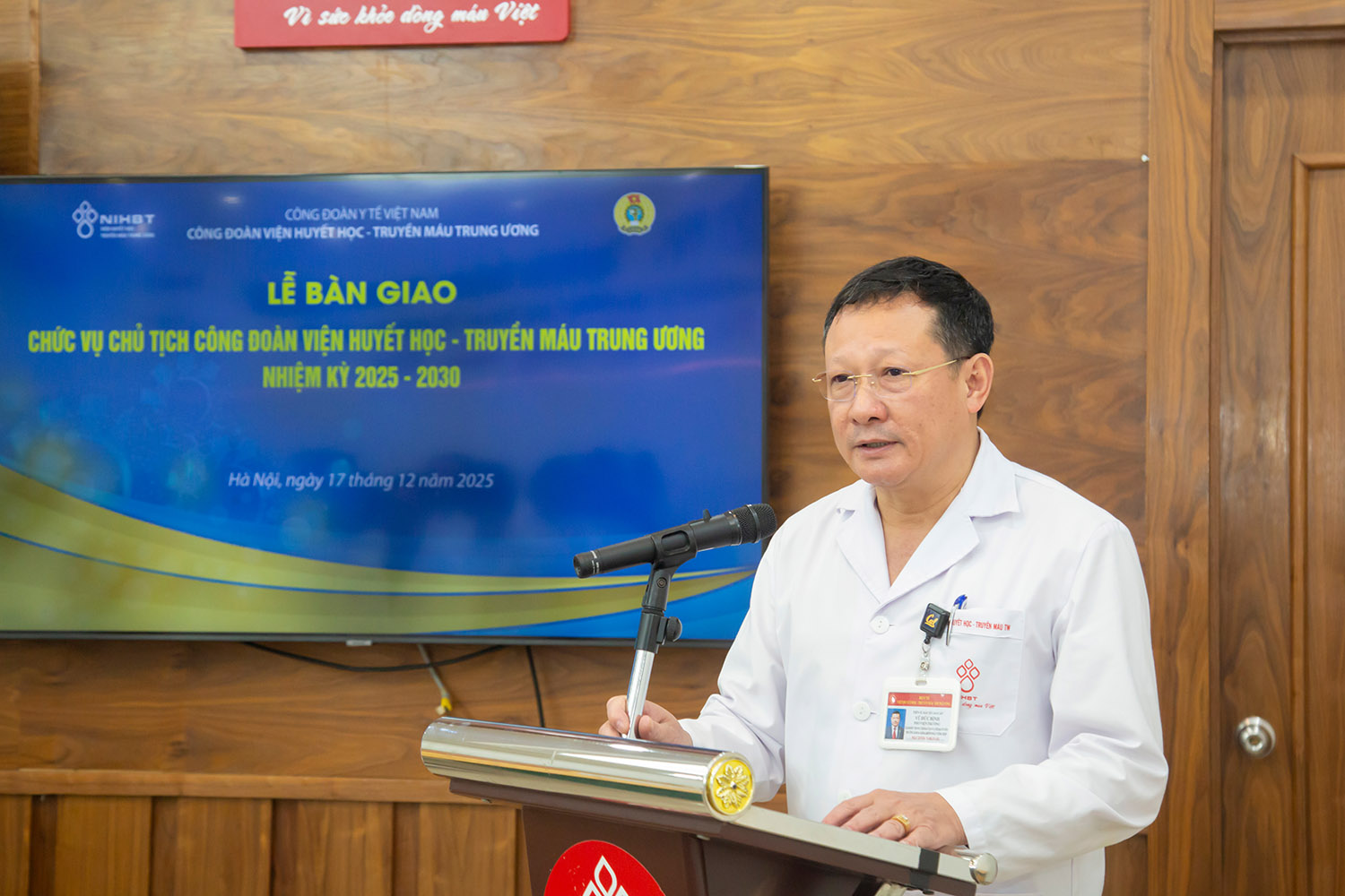 PGS.TS. Vũ Đức Bình, Phó Viện trưởng, Chủ tịch Công đoàn Viện Huyết học – Truyền máu TW nhiệm kỳ 2025-2030 phát biểu tại buổi lễ.
