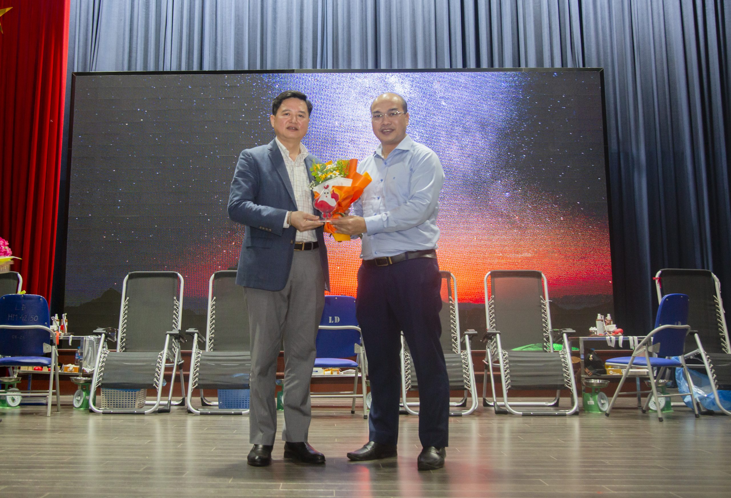 Ông Nguyễn Văn Nhữ, Phụ trách Văn phòng Trung tâm Máu Quốc gia đại diện cho Viện Huyết học – Truyền máu Trung ương tặng hoa, biểu trưng linh vật hiến máu tình nguyện cho đồng chí Cầm Văn Thanh, Phó Bí thư chuyên trách Đảng ủy Bộ Dân tộc và Tôn giáo.