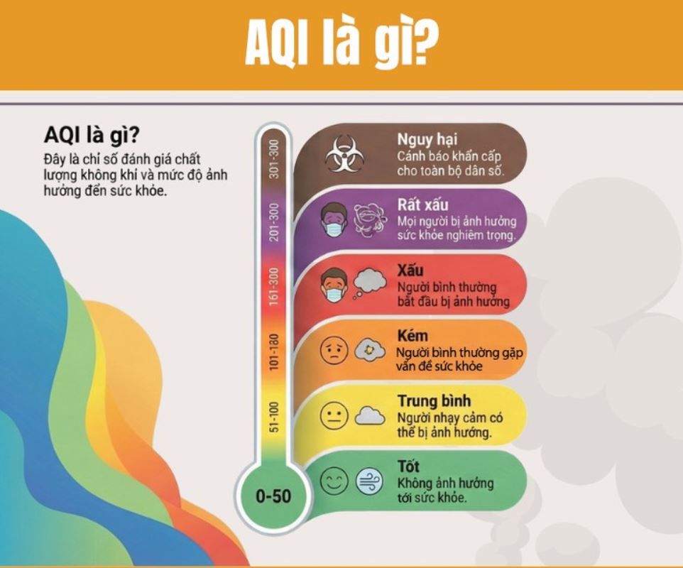 Chỉ số AQI được tính theo thang điểm (06 khoảng giá trị AQI) tương ứng với biểu tượng và các màu sắc để cảnh báo chất lượng không khí và mức độ ảnh hưởng tới sức khỏe con người, cụ thể như sau: