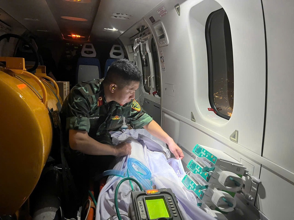 Lúc 23h, trực thăng cất cánh đưa bệnh nhân về TPHCM. Trong hơn 3 giờ bay đêm, hai bác sĩ túc trực không rời, liên tục theo dõi các chỉ số sinh tồn, duy trì thở máy, truyền dịch và kiểm soát tình trạng sốc vì nguy cơ tràn khí và tràn máu màng phổi có thể tái diễn do thay đổi áp suất khi bay cao.