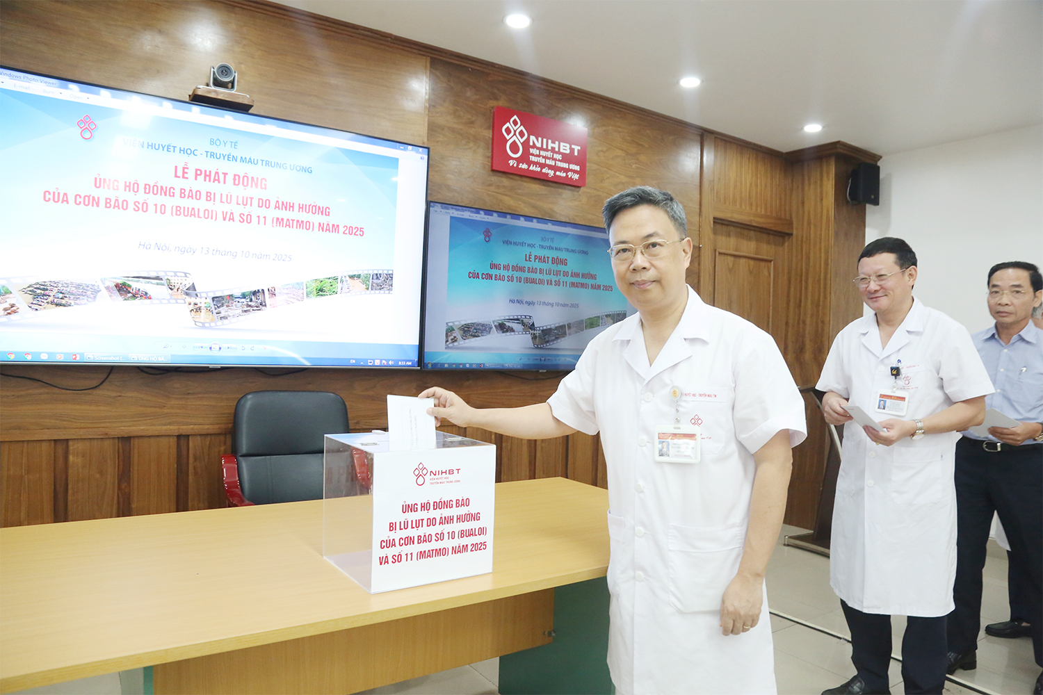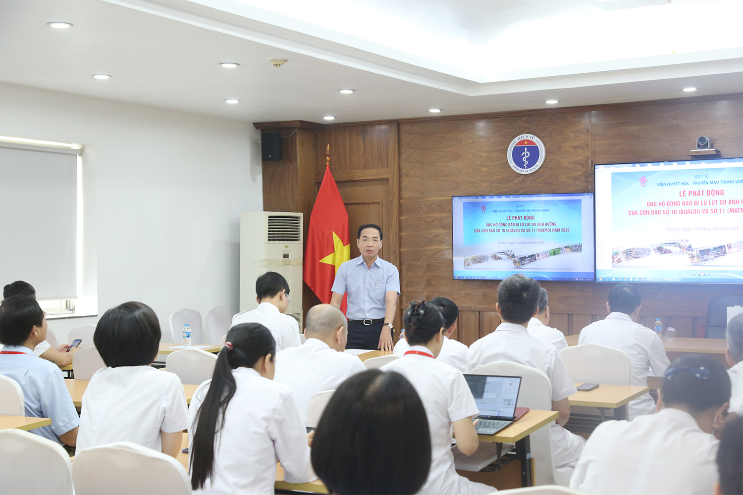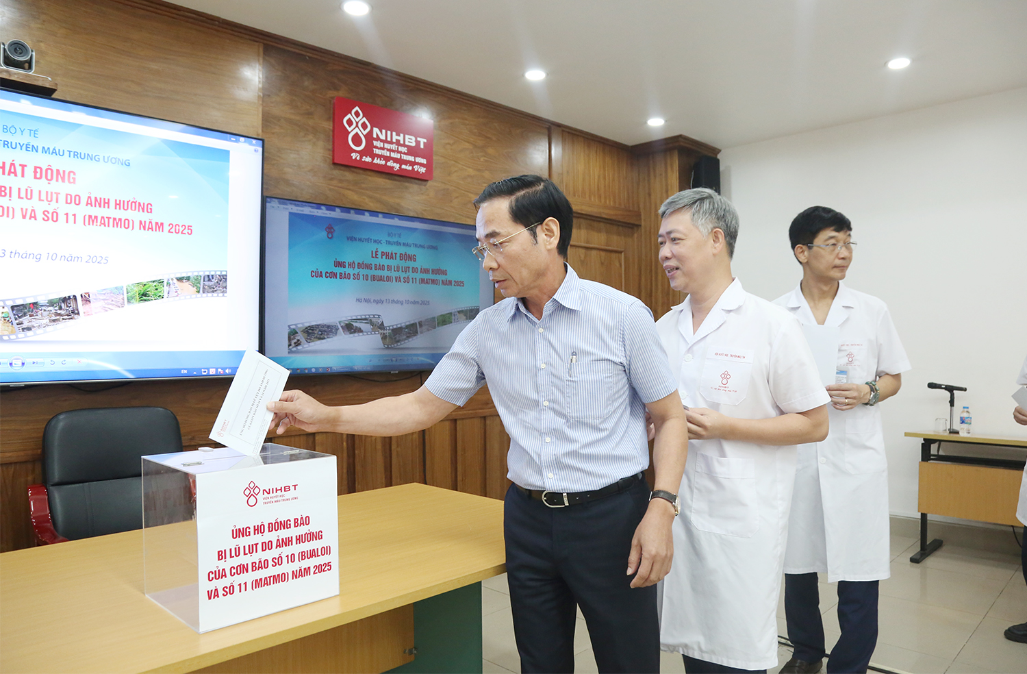 Với tinh thần “tương thân tương ái”, “lá lành đùm lá rách”, đồng thời hưởng ứng lời kêu gọi của Ủy ban Trung ương MTTQ Việt Nam, ngày 13/10, Viện Huyết học – Truyền máu Trung ương tổ chức phát động chương trình quyên góp, ủng hộ đồng bào các địa phương khắc phục hậu quả lũ lụt do ảnh hưởng của cơn bão số 10 (BUALOI và số 11 MATMO) gây ra.