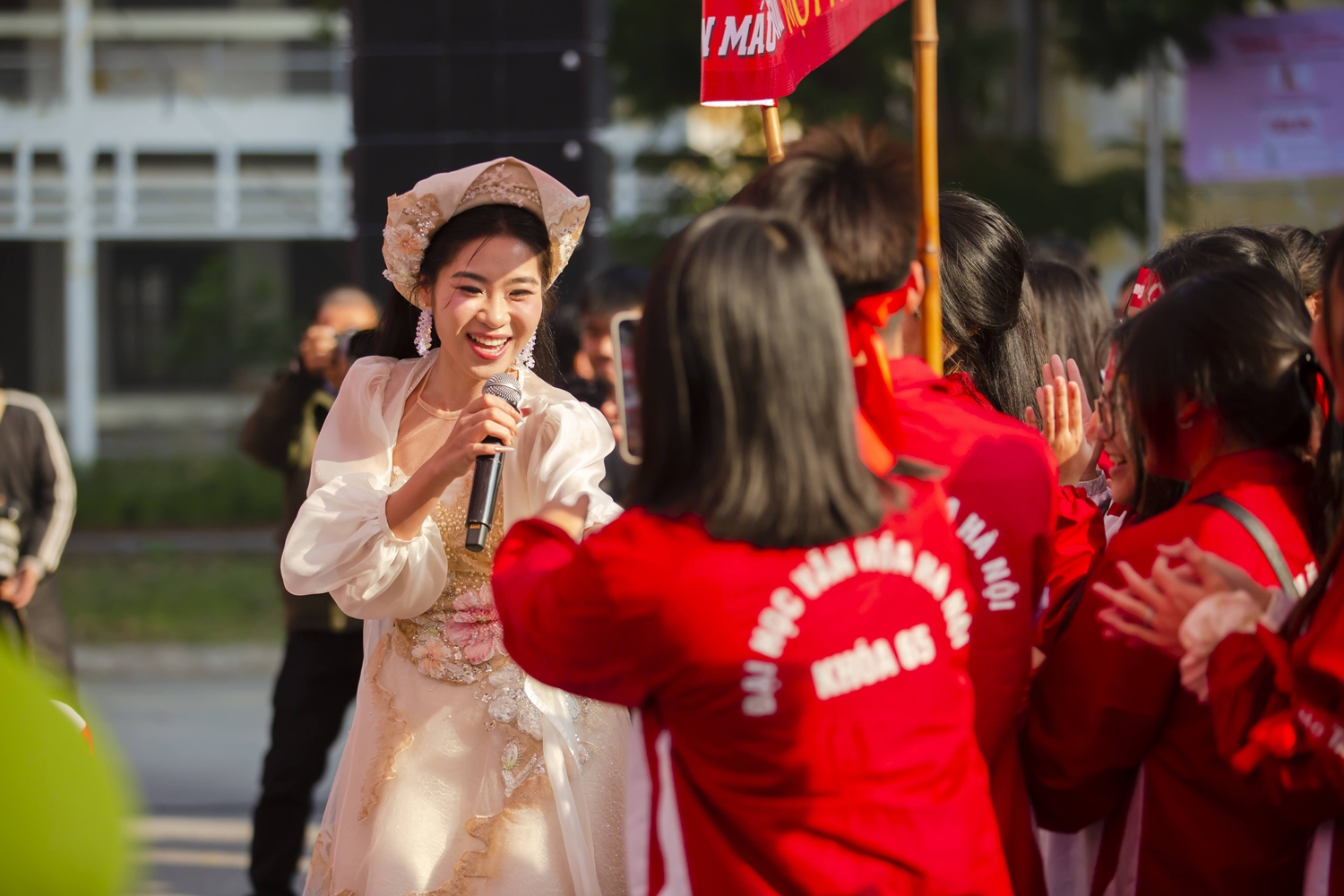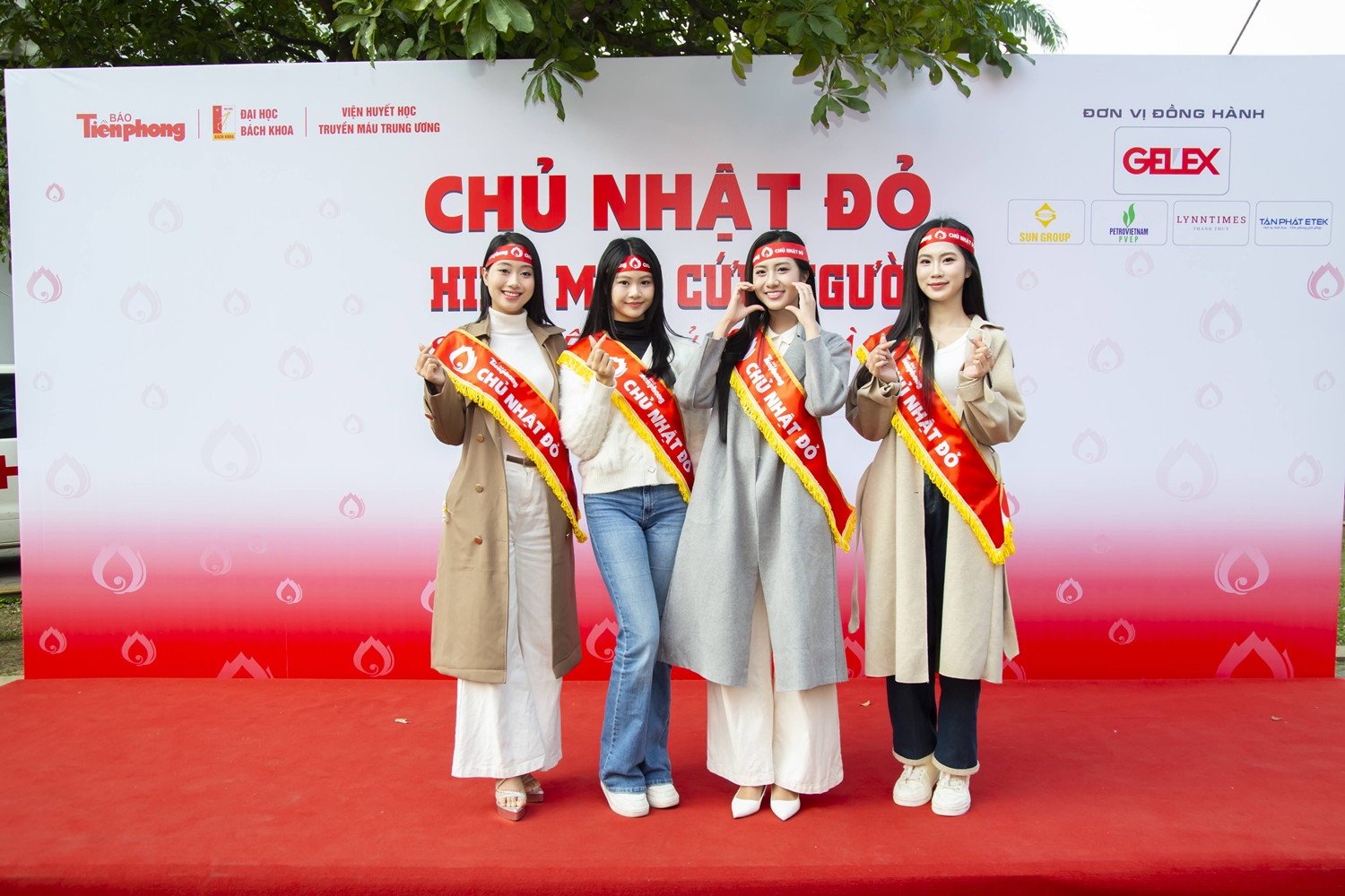 Hoa hậu Việt Nam 2024 Hà Trúc Linh (đứng thứ 2 từ phải qua), người đẹp Hồ Ngọc Phương Linh (thứ 3 từ phải qua), người đẹp Nguyễn Thị Thu Hằng (ngoài cùng bên phải) và người đẹp Nguyễn Mai Phương tại Chủ nhật Đỏ 2026.