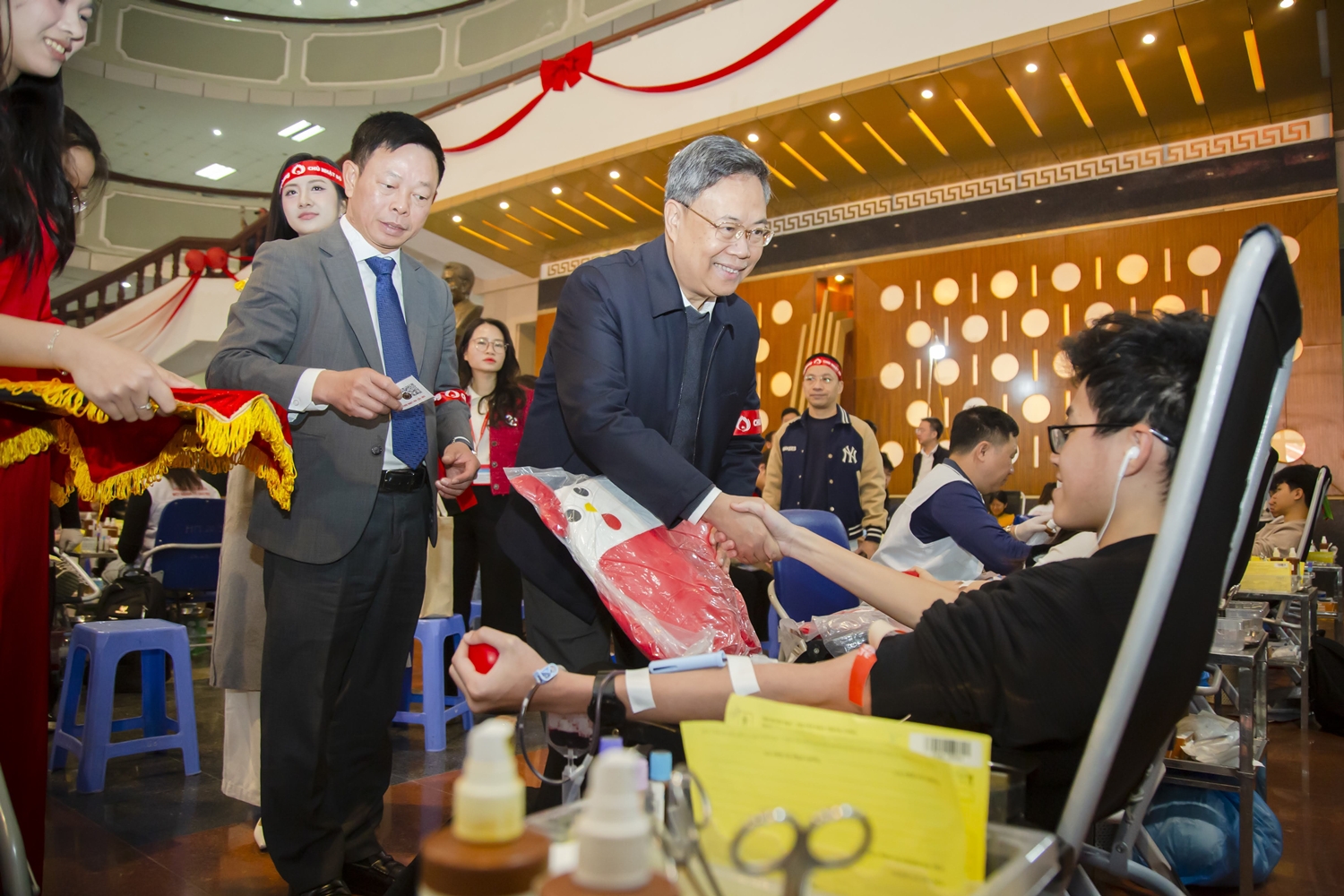 Các đại biểu thăm và tặng quà cho người hiến máu.