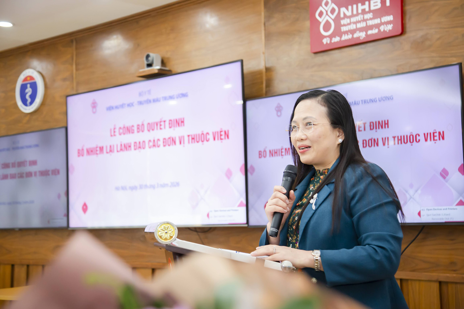 Thực hiện kế hoạch công tác cán bộ và Nghị quyết số 86-NQ/ĐU ngày 26/3/2026 của Đảng ủy Viện Huyết học – Truyền máu Trung ương về công tác cán bộ, sáng nay 30/3/2026, Viện Huyết học – Truyền máu Trung ương đã tổ chức Lễ công bố quyết định bổ nhiệm lại lãnh đạo các đơn vị thuộc viện.