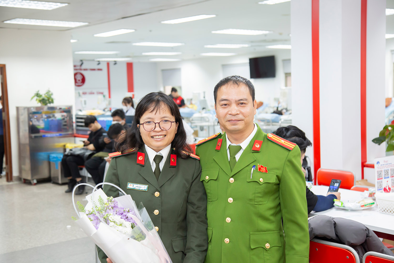 Vợ chồng Thiếu tá Nguyễn Thanh Xuân (Cục Cảnh sát Môi trường, Bộ Công an) đã có 1 ngày ý nghĩa khi đi hiến máu cùng nhau.