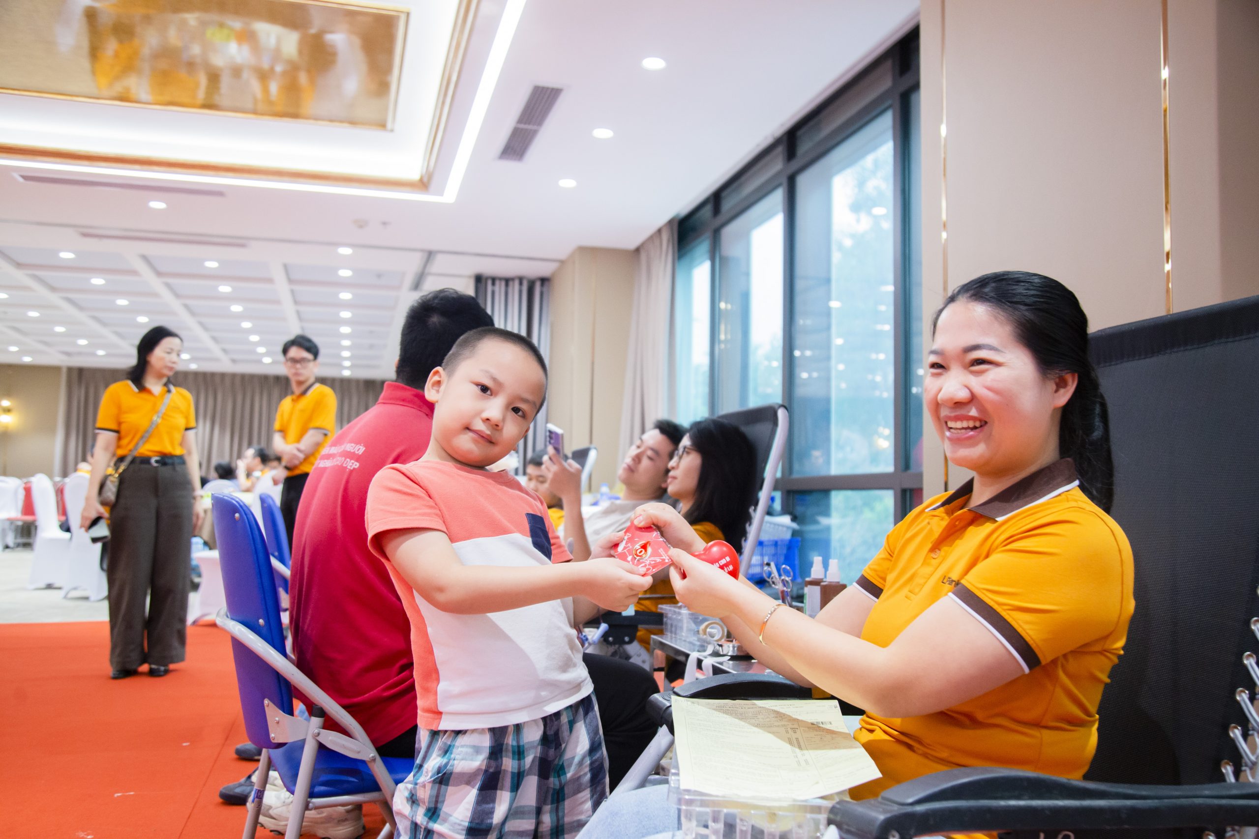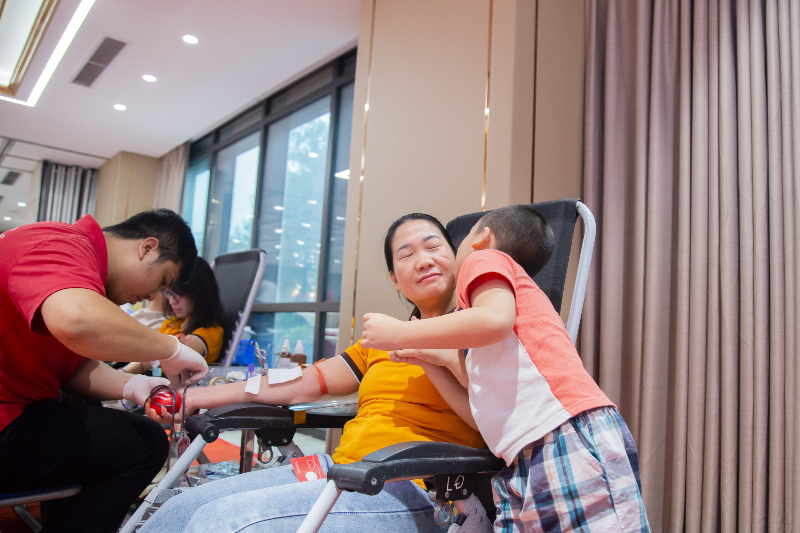 Suốt quá trình hiến máu, hai mẹ con không ngừng trao cho nhau những cử chỉ âu yếm và lời động viên dịu dàng.