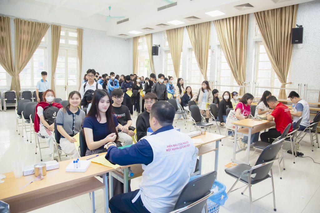 Các bạn sinh viên hào hứng xếp hàng chờ hiến máu.