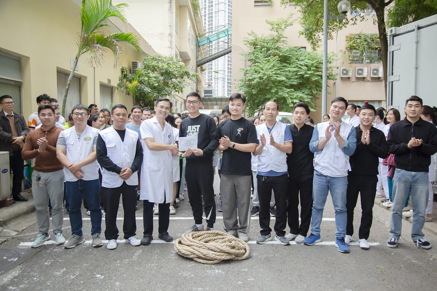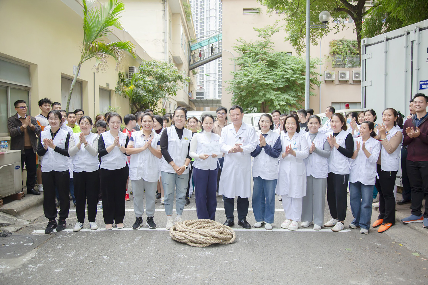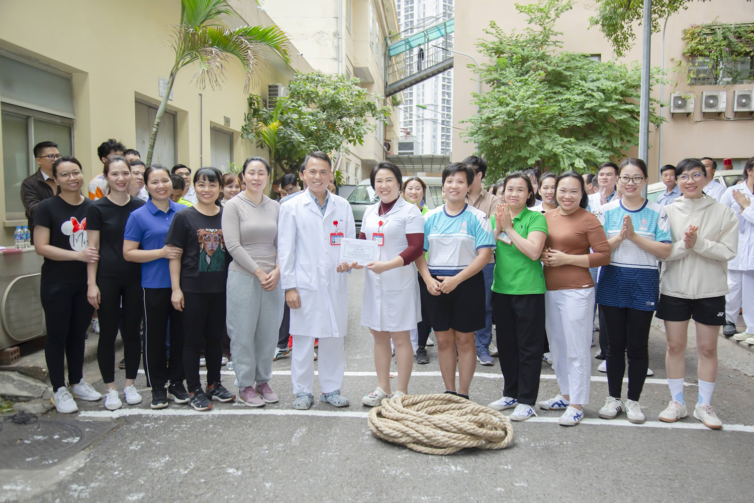 PGS.TS. Vũ Đức Bình, Phó Viện trưởng, Chủ tịch Công đoàn Viện và ThS. Nguyễn Thừa Thắng, Phó trưởng phòng Tổ chức cán bộ, Phó Chủ tịch Công đoàn Viện trao giải Vô địch môn Kéo co nam cho đội Lâm sàng và Vô địch nữ cho đội Trung tâm Máu quốc gia.