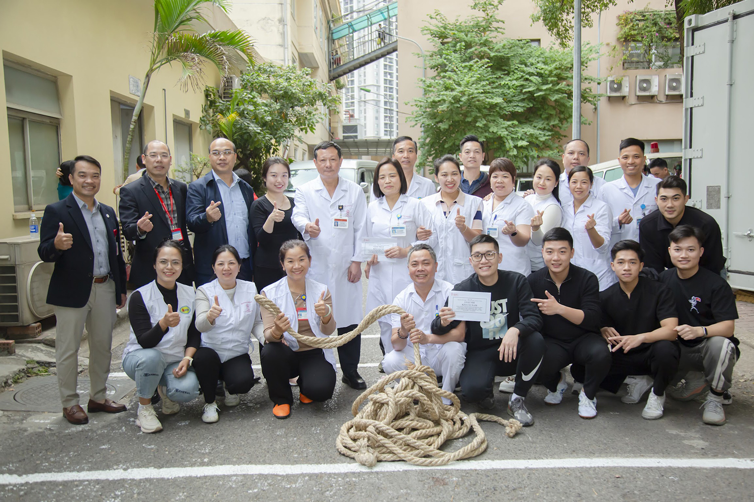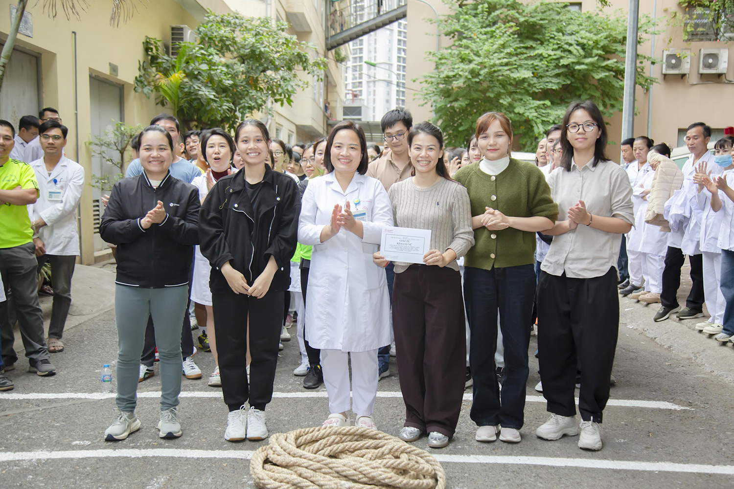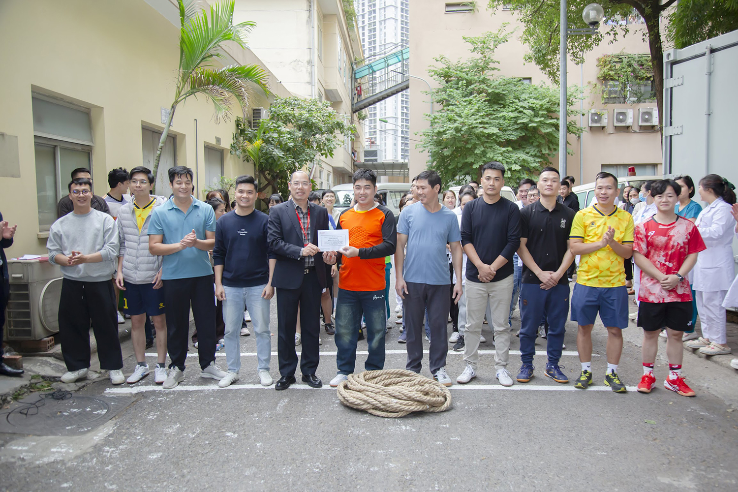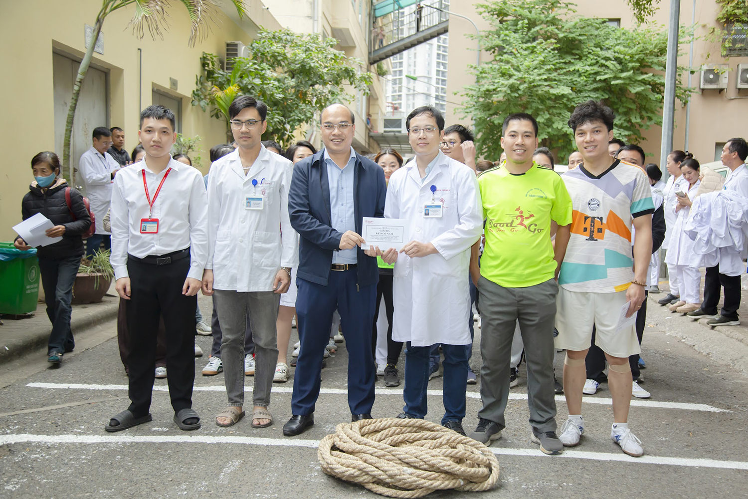 PGS.TS. Vũ Đức Bình, Phó Viện trưởng, Chủ tịch Công đoàn Viện và ThS. Nguyễn Thừa Thắng, Phó trưởng phòng Tổ chức cán bộ, Phó Chủ tịch Công đoàn Viện trao giải Vô địch môn Kéo co nam cho đội Lâm sàng và Vô địch nữ cho đội Trung tâm Máu quốc gia.