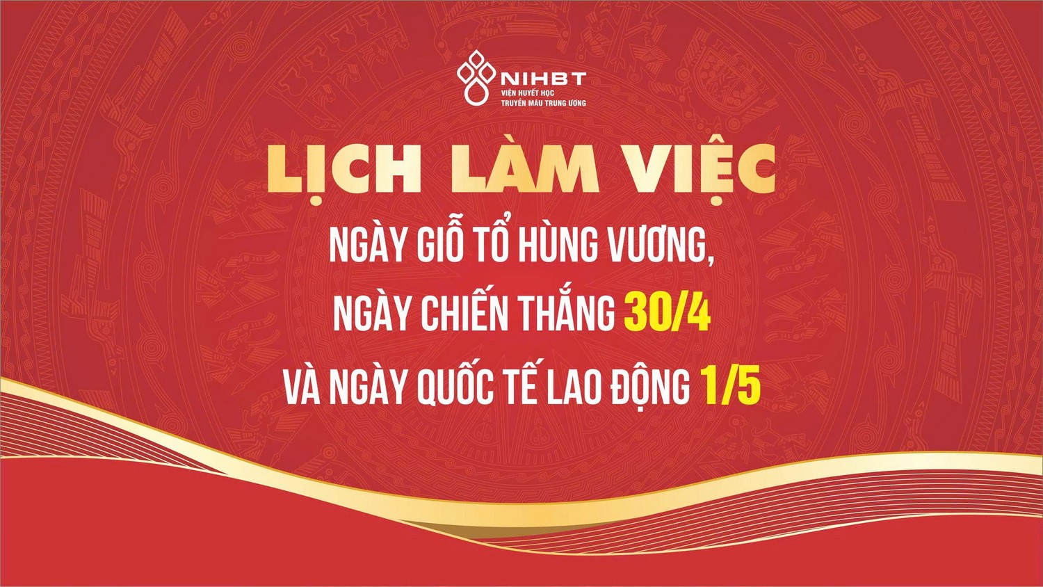 Viện Huyết học – Truyền máu Trung ương trân trọng thông báo tới Quý vị về lịch làm việc của Viện kỳ nghỉ ngày Giỗ Tổ Hùng Vương, Ngày Chiến thắng 30/4 và Ngày Quốc tế Lao động 1/5.