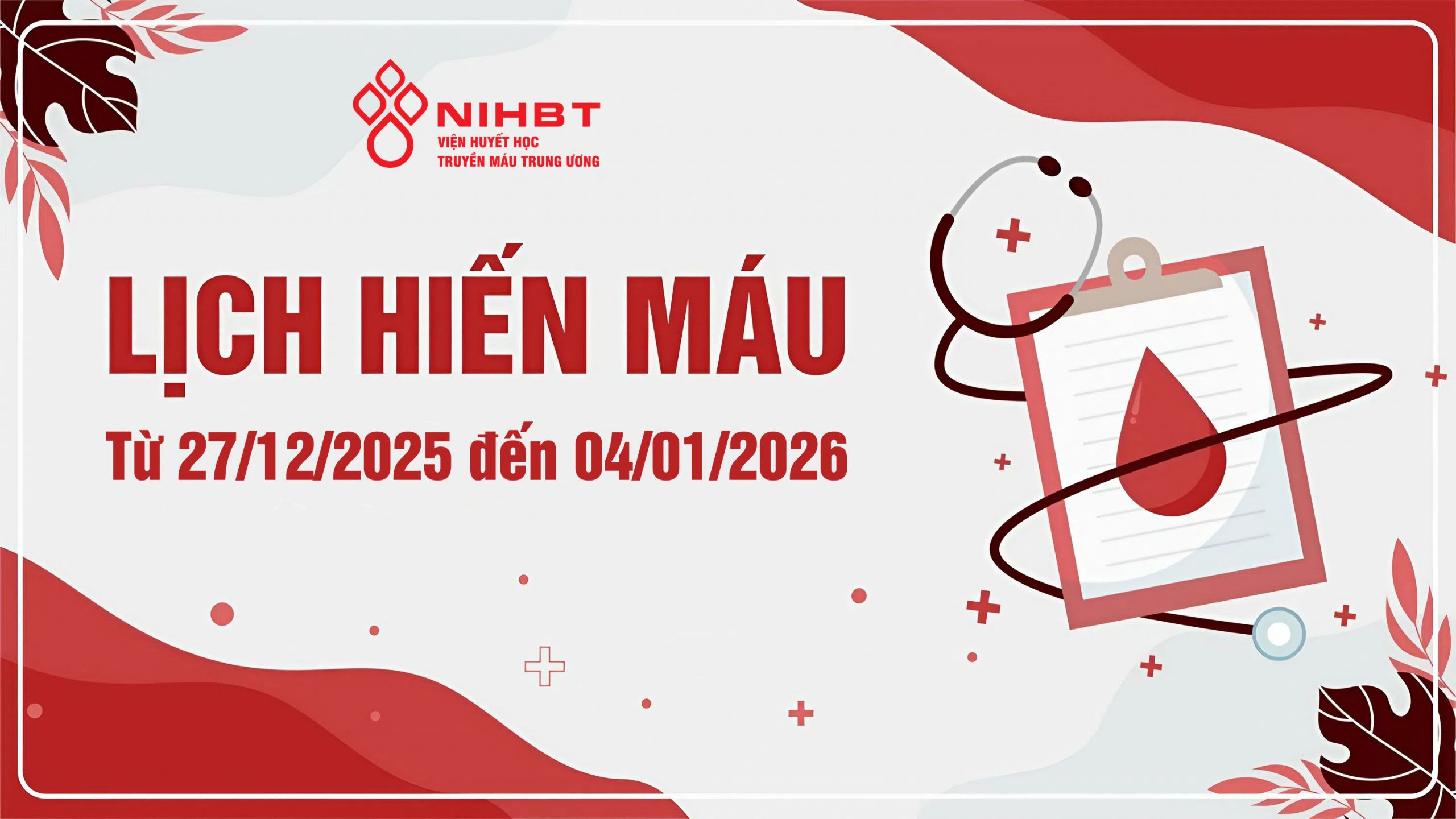 Viện Huyết học – Truyền máu Trung ương trân trọng thông báo tới Quý vị về lịch làm việc và nghỉ lễ trong dịp Tết Dương lịch năm 2026 như sau: