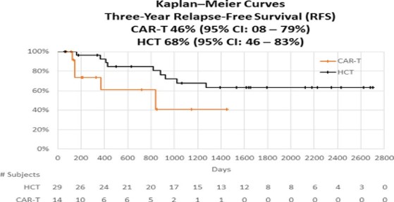 Nhiều nghiên cứu cho thấy tỷ lệ đáp ứng toàn phần (CR) dao động từ 40–80% ở nhóm bệnh nhân R/R DLBCL, trong khi thời gian sống không tiến triển có thể kéo dài trên hai năm ở những bệnh nhân duy trì được quần thể tế bào CAR-T bền vững (Abramson, Blood Reviews, 2024). Biểu đồ Kaplan–Meier cho thấy liệu pháp CAR-T cell giúp cải thiện rõ rệt tỷ lệ sống toàn bộ (OS) và sống không tiến triển bệnh (PFS) ở bệnh nhân ung thư dòng tế bào B tái phát hoặc kháng trị. Sau thời gian theo dõi trung vị 24 tháng, tỷ lệ OS đạt 49,1% và PFS đạt 21,0%, cho thấy một phần đáng kể bệnh nhân duy trì đáp ứng lâu dài sau điều trị.