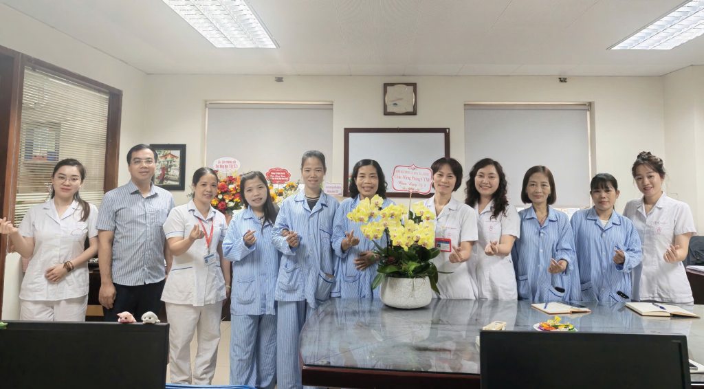 Chị Vũ Thị Hoa, chị Nguyễn Thị Kim Tuyến cùng người bệnh Phòng 331, Trung tâm Thalassemia tặng hoa chúc mừng Phòng Công tác xã hội.