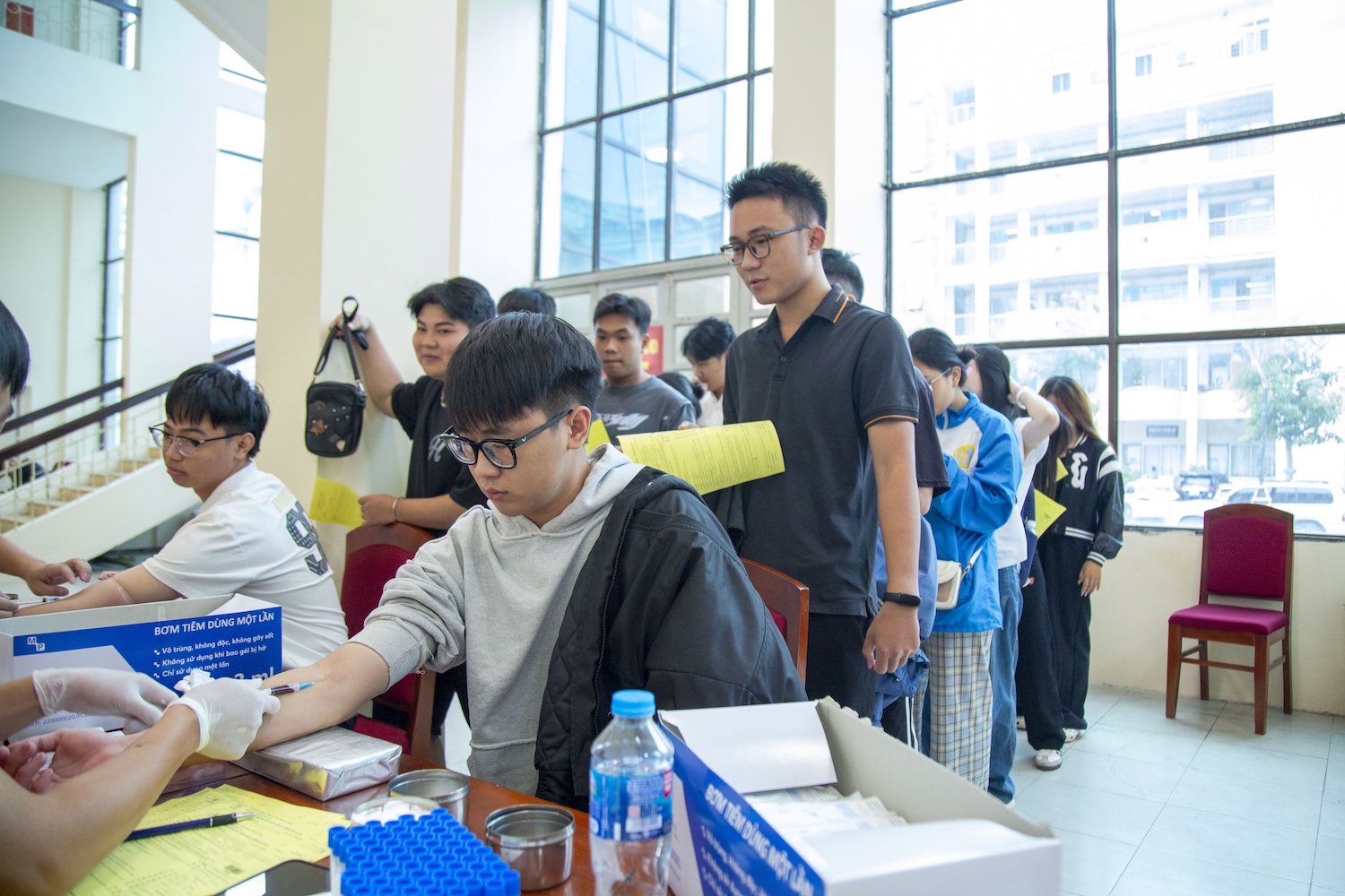 Nhiều sinh viên tranh thủ đến sớm trước ca học. Ai cũng háo hức, mong muốn được góp giọt máu của mình gửi tới những bệnh nhân đang cần máu điều trị.