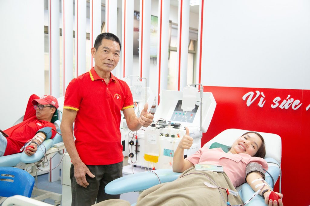 Ông Lê Trung Truyền cùng con gái Lê Thị Thu Thanh đang hiến tiểu cầu.