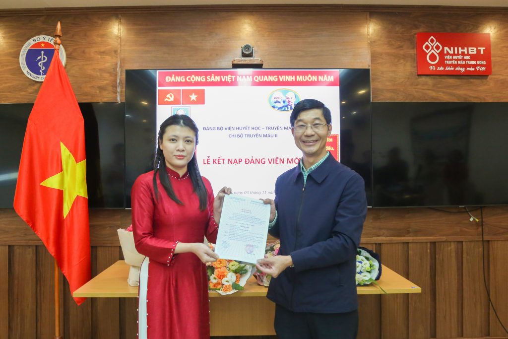 Đồng chí Trần Ngọc Quế, Đảng uỷ viên, Bí thư Chi bộ Chi bộ Truyền máu II  trao quyết định kết nạp đảng cho đồng chí Đặng Minh Hằng.