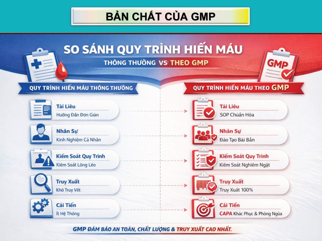 Bản chất của GMP là đảm bảo chất lượng an toàn tuyệt đối. So với quy trình hiến máu thông thường, quy trình hiến máu theo GMP không thay đổi các bước chuyên môn, mà chuẩn hóa toàn bộ hệ thống vận hành nhằm đảm bảo an toàn, chất lượng nghiêm ngặt và khả năng truy xuất ở mức cao nhất.