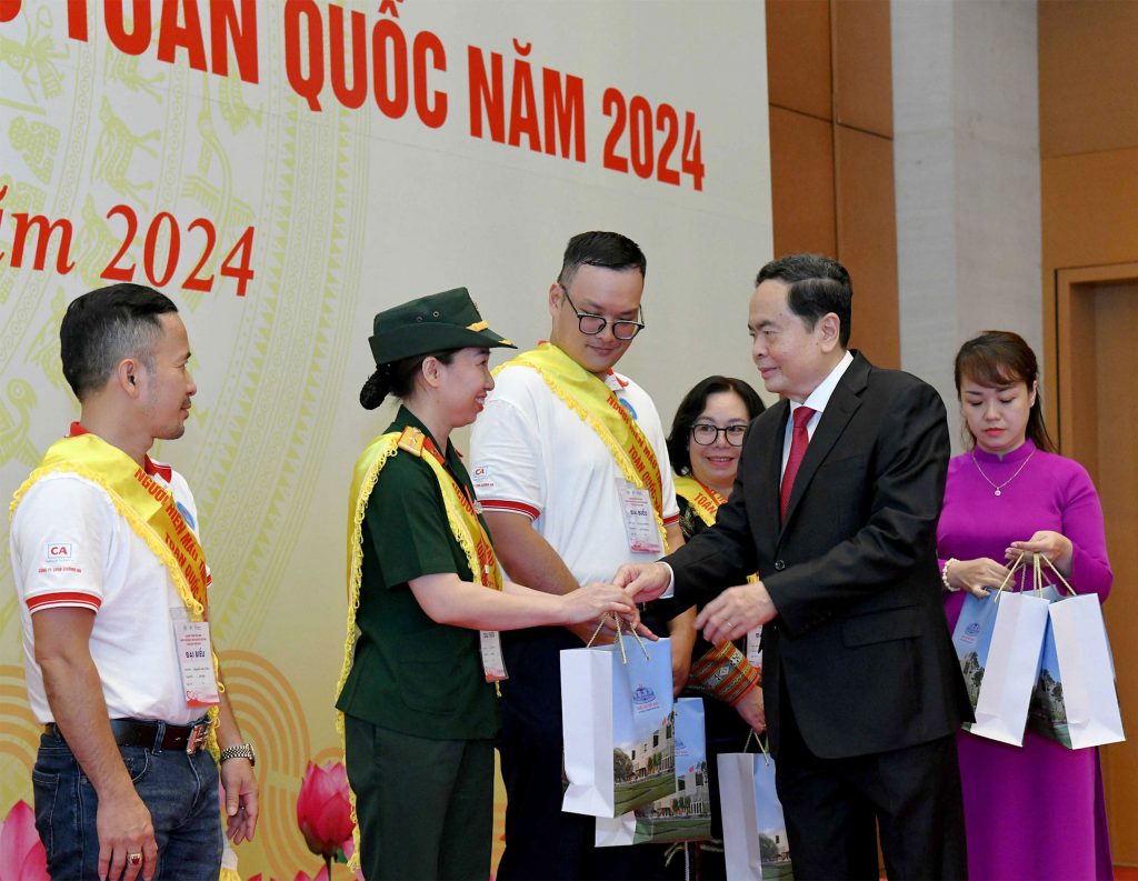 …và được Uỷ viên Bộ Chính trị, Chủ tịch Quốc hội Trần Thanh Mẫn tặng quà lưu niệm trong chương trình Gặp mặt người hiến máu tình nguyện tiêu biểu toàn quốc năm 2024.