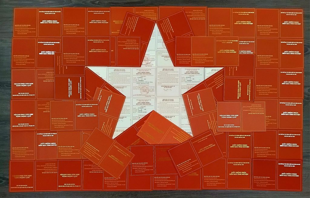 Những tấm giấy chứng nhận hiến máu tình nguyện, kỷ vật sau mỗi lần hiến máu, hiến tiểu cầu được chị Huế xếp thành hình lá cờ Tổ quốc.