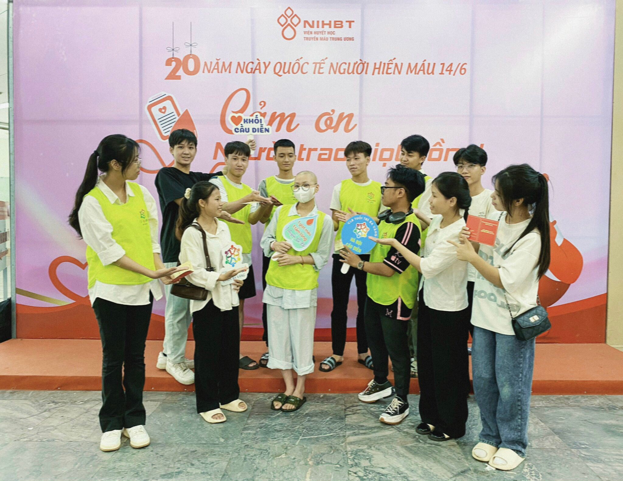 Bạn trẻ lạc quan và vui vẻ chụp ảnh kỷ niệm nhân dịp ngày 8/3 được nhận quà từ các anh chị đang cùng điều trị ung thư máu tại Viện Huyết học – Truyền máu Trung ương.