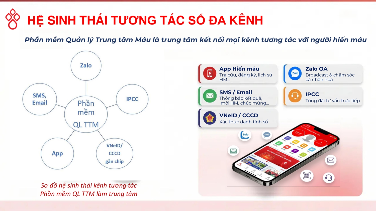 Tại TTMQG, ngoài việc sử dụng phần mềm quản lý Trung tâm máu, trong thời gian qua đã đẩy mạnh việc triển khai thực hiện các nền tảng khác đồng bộ như: Tổng đài chăm sóc người hiến máu; Ứng dụng di động App “Hiến máu”; Trang Zalo OA hay hệ thống tin nhắn SMS thương hiệu và Email marketing… Những nền tảng trên kết nối với phần mềm lõi và được coi như những “mạch máu” giúp dữ liệu được luân chuyển, tương tác và tạo ra giá trị thực tế.