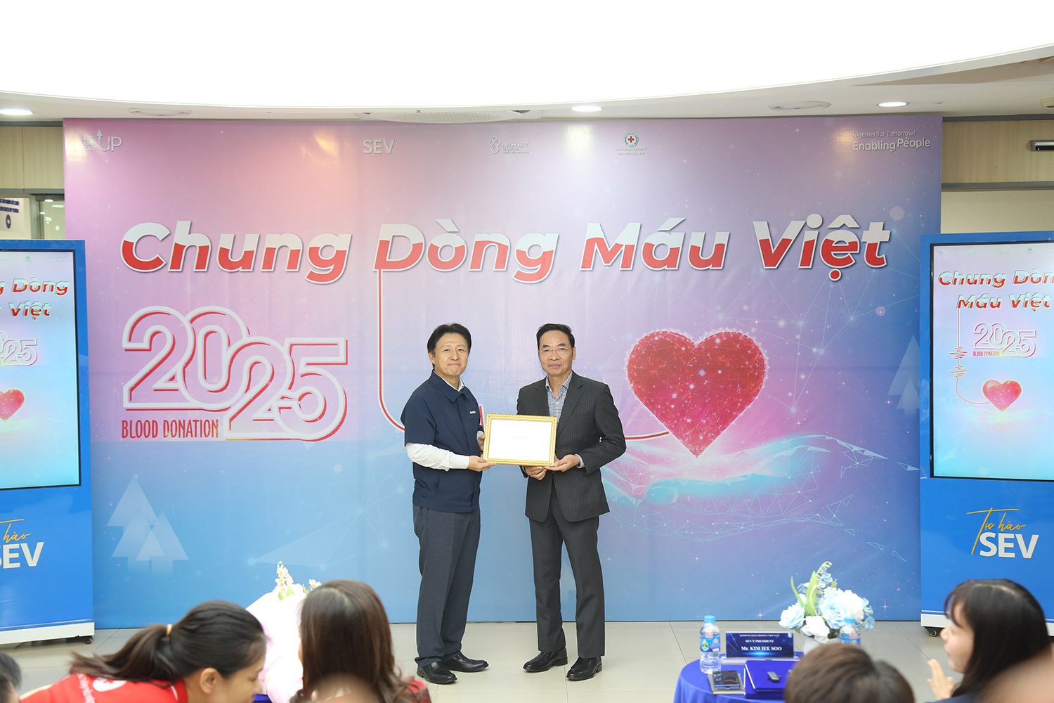 Thay mặt Viện Huyết học – Truyền máu TW, ông Lê Lâm trao Giấy chứng nhận đơn vị tham gia tổ chức hiến máu năm 2025 cho Samsung Electronics Việt Nam.