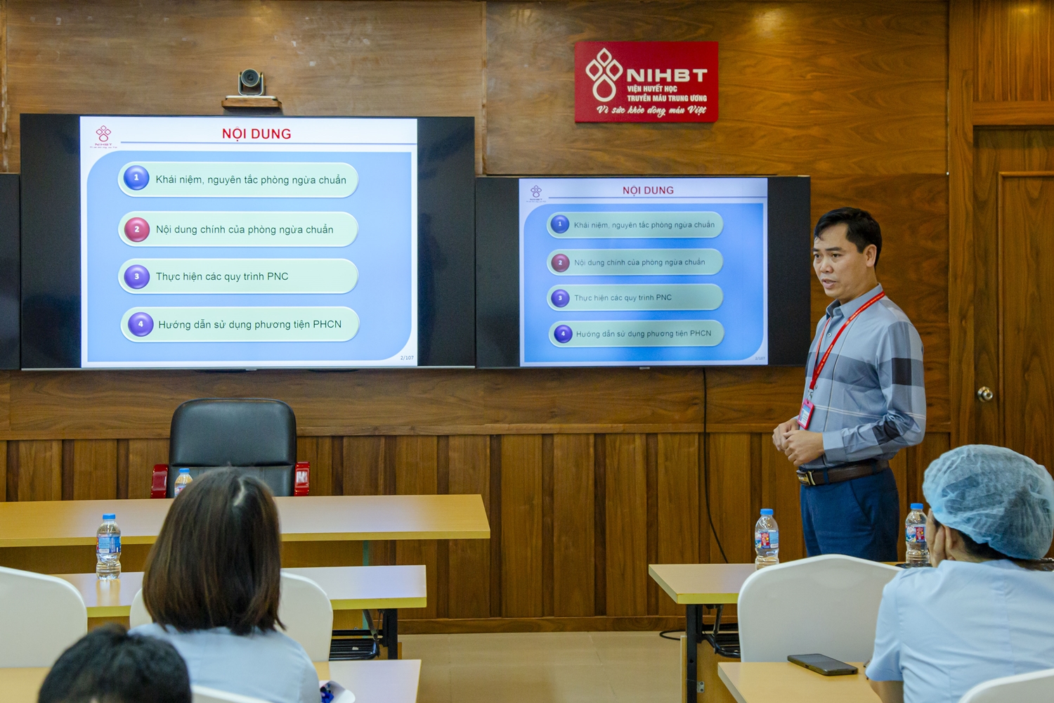 Thực hiện kế hoạch đào tạo liên tục nội bộ năm 2026, ngày 24/3/2026, Viện Huyết học – Truyền máu TW đã tổ chức buổi tập huấn phòng ngừa chuẩn và hướng dẫn sử dụng phương tiện phòng hộ cá nhân.