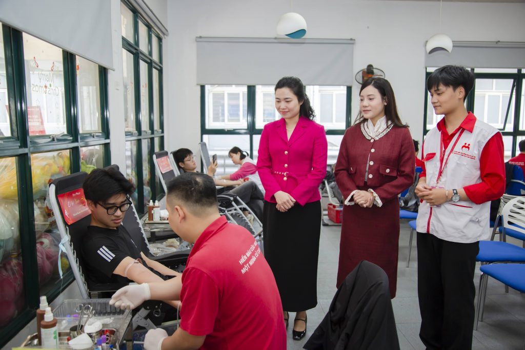 Chị Nguyễn Vân Anh (áo hồng) cùng chị Nguyễn Thị Thanh Mai, Uỷ viên BCH Đoàn trường, Chủ nhiệm CLB Thanh niên vận động hiến máu tình nguyện động viên các bạn sinh viên tham gia hiến máu.