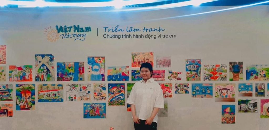Họa sĩ nhí Chu Ánh Tuyết đầy lạc quan bên các tác phẩm của mình.