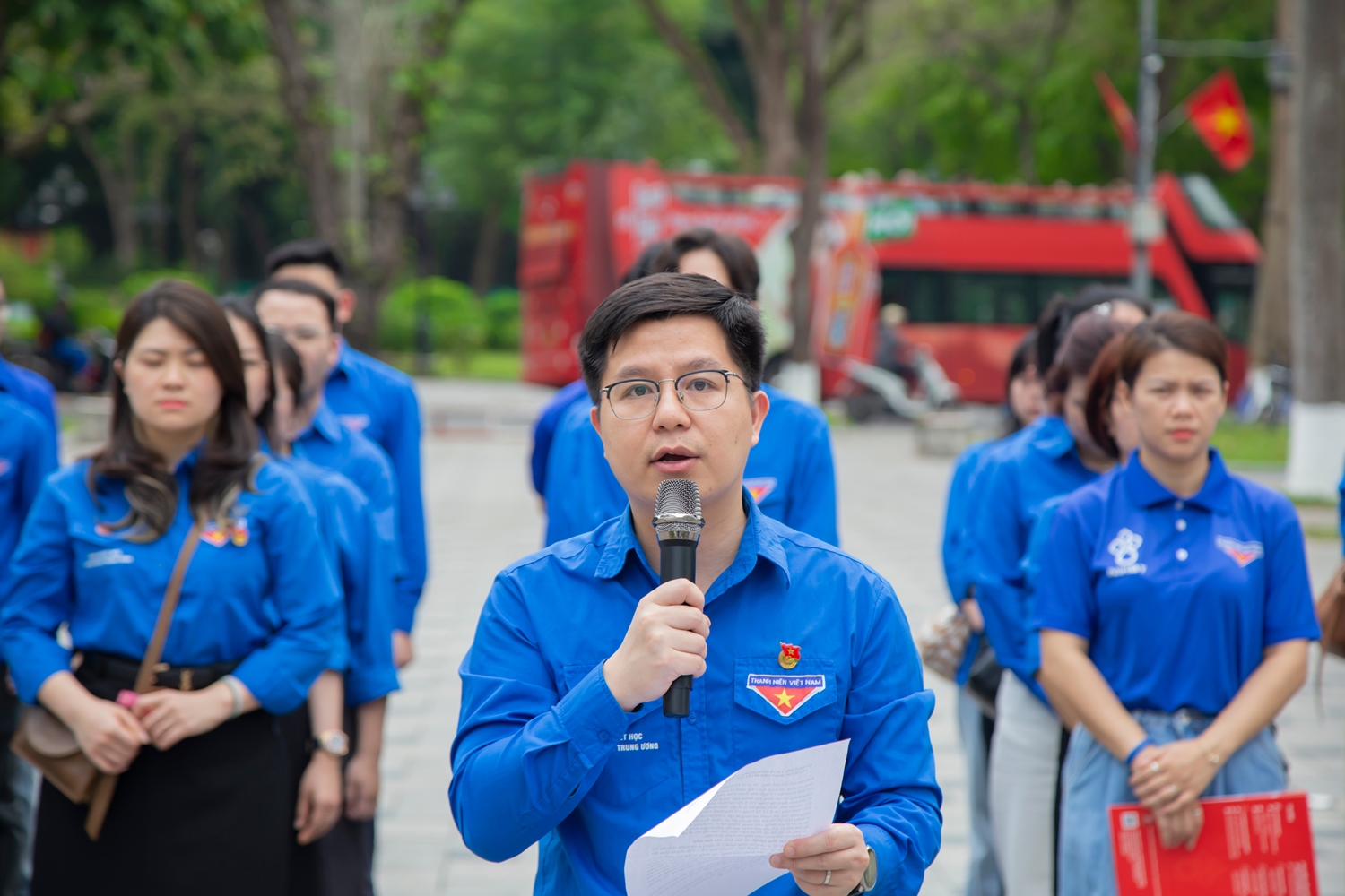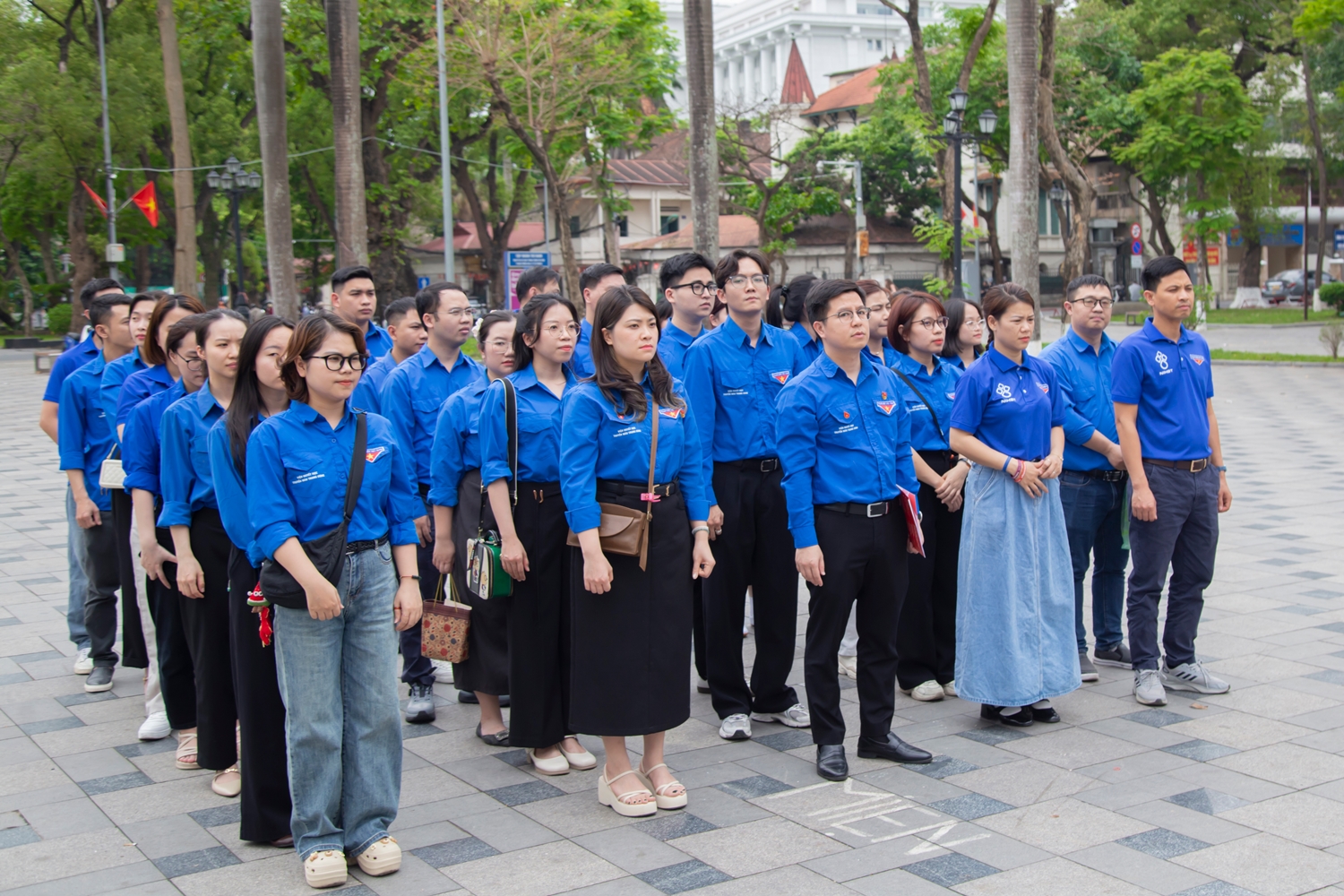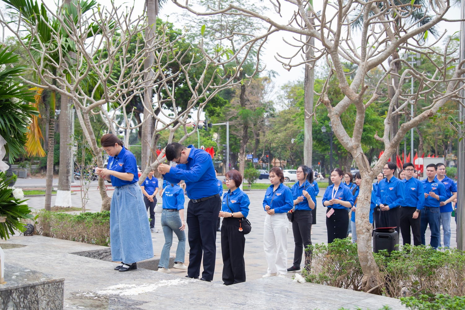 Đoàn viên, thanh niên Viện Huyết học – Truyền máu TW trang nghiêm đứng trước tượng đài Anh hùng liệt sĩ Lý Tự Trọng.