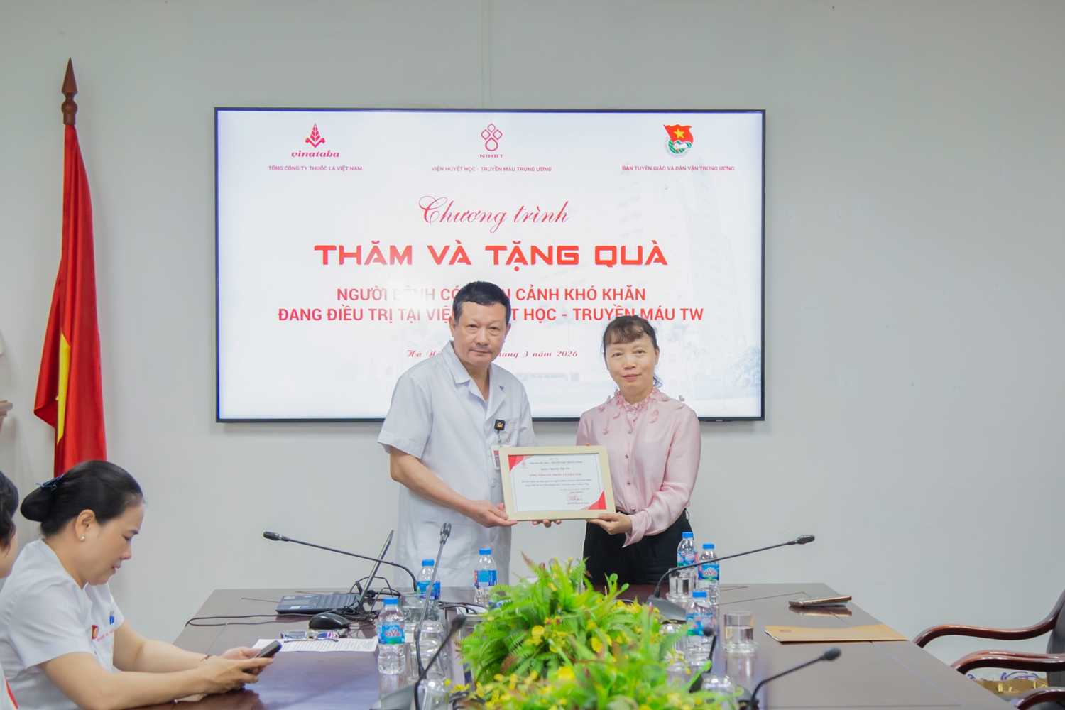 Phó Viện trưởng Viện Huyết học – Truyền máu TW trân trọng bày tỏ sự cảm ơn đối với đoàn công tác. Nhân dịp này, PGS.TS. Vũ Đức Bình thay mặt Ban Lãnh đạo Viện trao tặng thư tri ân cho đại diện Đoàn Thanh niên Ban Tuyên giáo và Dân vận TW và Tổng Công ty Thuốc lá Việt Nam.