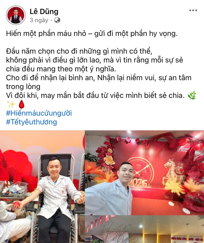 Anh Lê Việt Dũng tự hào chia sẻ trên mạng xã hội những tấm hình chụp khi tham gia hiến máu đầu xuân, đây không chỉ là kỷ niệm cá nhân, mà còn trở thành cầu nối giúp lan tỏa thông điệp nhân ái tới nhiều người hơn nữa.